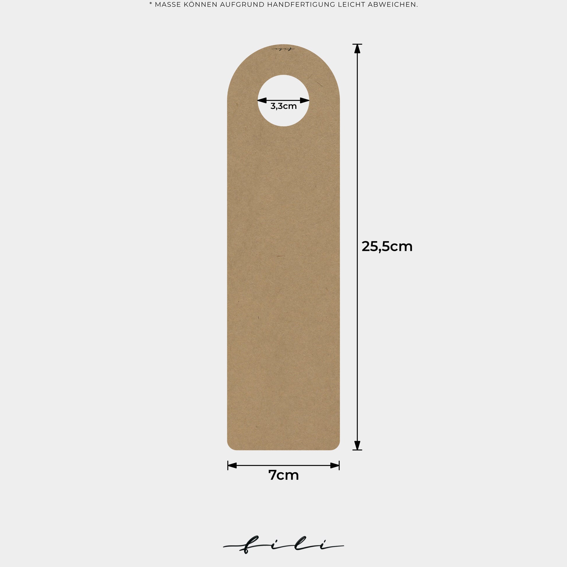 handgefertigte Geschenkanhänger in der Größe 7,0x25,5cm mit einer Lochstanzung von 3,3cm.
