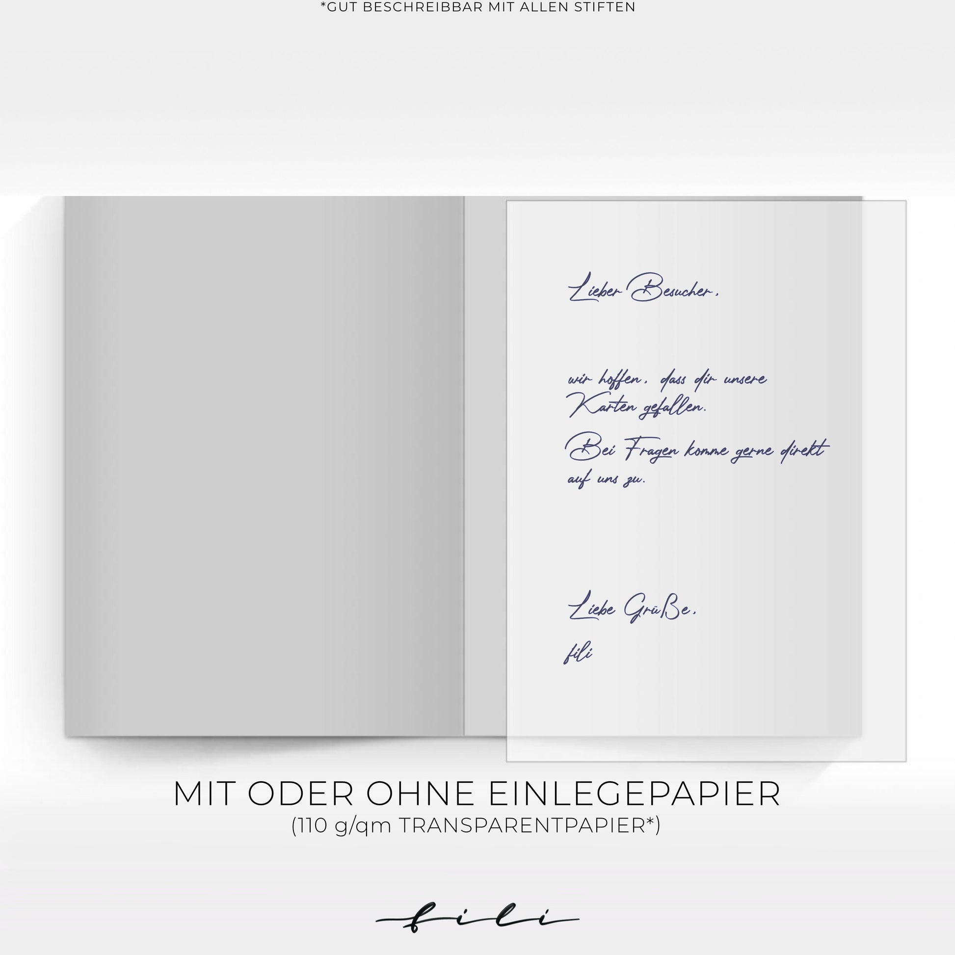 Wahlweise kannst du für die Klappkarten ein Einlegepapier aus 110g/qm Transparentpapier und/oder Kuverts dazu bestellen. Diese lassen sich ausgezeichnet mit allen gängigen Stiften optimal beschreiben.