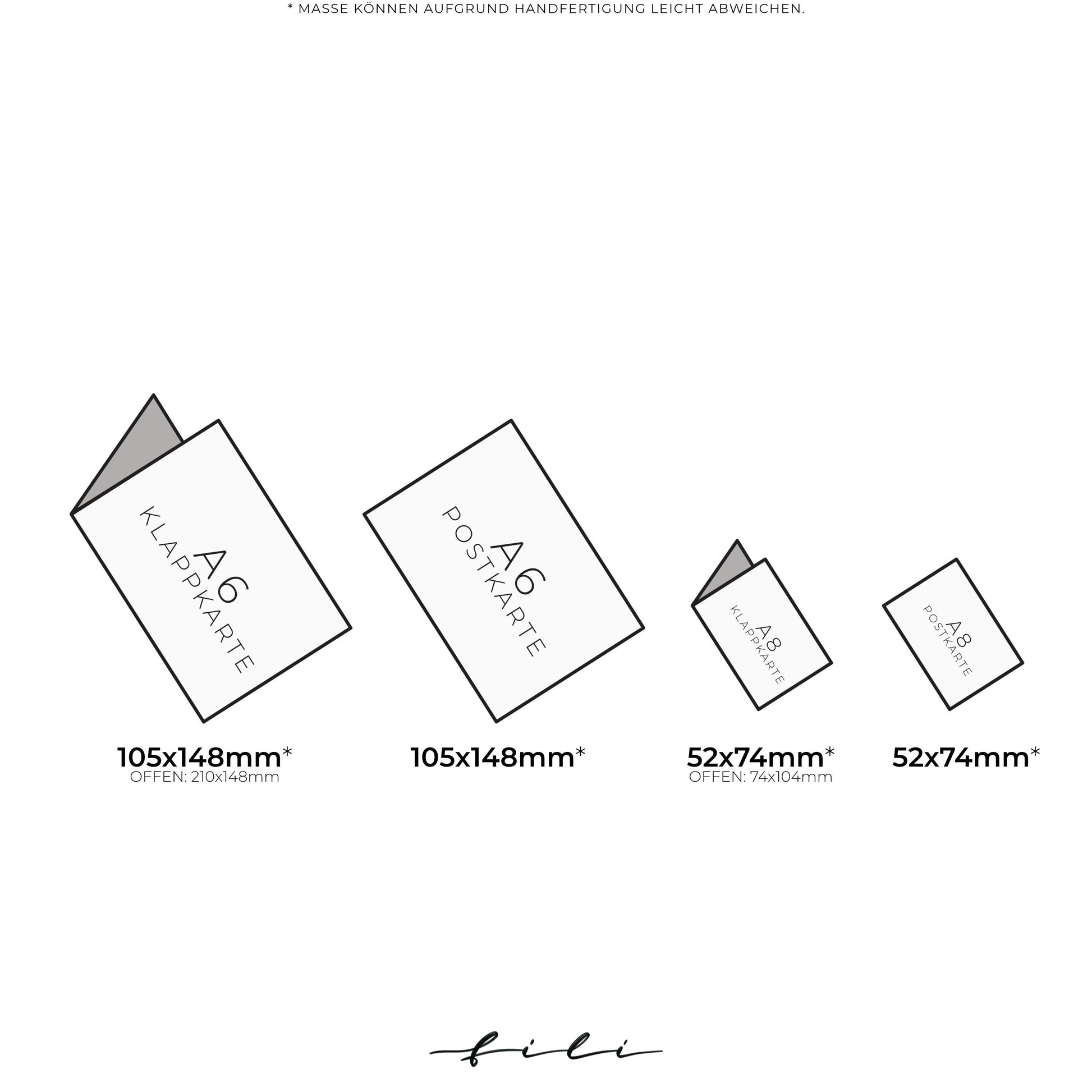Handgefertigte Karten in unterschiedlichen Größen DIN A6 & DIN A8 jeweils als Klapp- oder Postkarte verfügbar.